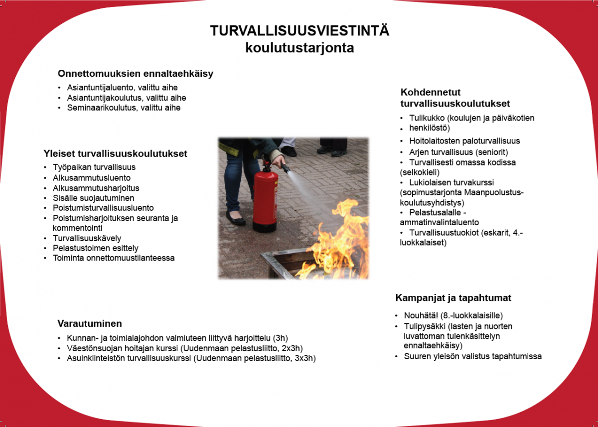 Koulutustoiveista ja –tarpeista voit ottaa yhteyttä alueen turvallisuuskouluttajiin.